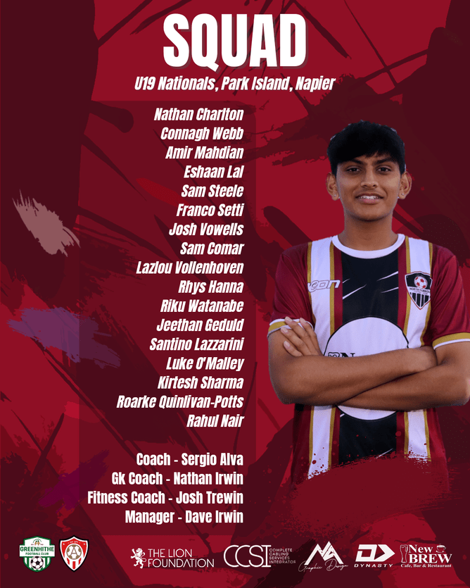 The majority of the squad have played together before, either in younger age groups or with the Under 23 team through the 2024 season, so they are all very familiar with each other. The boys have been drawn in Pool D, alongside Tawa FC of Wellington, Otumoetai FC of Tauranga, Taupo AFC, Cambridge FC and Western Rangers of Hastings. It will be a tough group but with tournament football anything is possible.