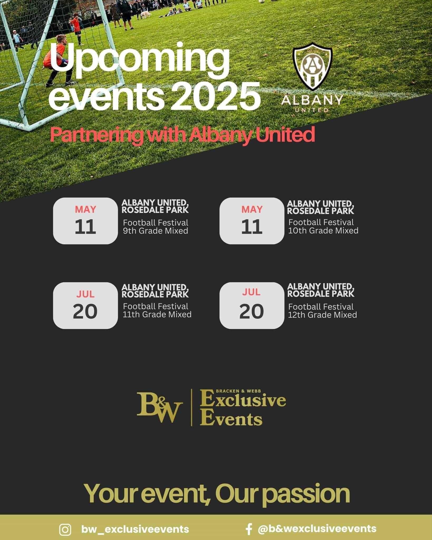 We are pleased to announce that we will be again running several junior football festivals in 2025. Run by the team at B&W Exclusive Events, these festivals are always a day of fun competition for teams around Auckland! The calendar of events are listed below,